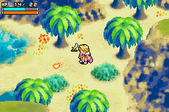 La jugabilidad es sencilla y efectiva, aunque no estaría de más que nuestro héroe fuera un pelín más ágil y rápido. El botón A se usa para las armas o hechizos y el B para el resto de objetos. Podemos asignar tres armas u objetos a cada botón, y pasaremos de una a otra con los botones R y L de GBA. De este modo podemos cambiar rápidamente de arma o utilizar el item que necesitamos sin dar un respiro a los enemigos. Es importante llevar equipados los items que más usemos, así como las alas de ángel (para poder volver al poblado si estamos en un aprieto), ya que cuando accedemos a los menús o al inventario (con el botón START) la acción no se detiene. Vamos, que no podemos pausar el juego. Sólo cuando acabemos con todos los enemigos que hay en pantalla podremos acceder a los menús con seguridad.