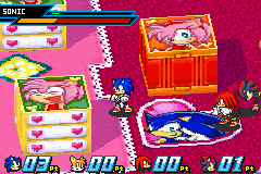 Posiblemente lo que más llamo la atención de este título desde que salieron sus primeras capturas fueron las arenas poligonales en donde se disputaban los combates. Tratándose de una GBA está bastante claro que la complejidad de las mismas no va a ser muy alta, más bien todo lo contrario, ya que suelen consistir en un plano con algunos obstáculos (muros, barreras, cajas, muebles...) sencillos. Las texturas por contra están más definidas de lo que se podría esperar y los diseños de las mismas en algunos escenarios son de lo más llamativo (atención a la "amorosa" habitación de Amy y a la biblioteca). Los sprites continúan con el estilo de los Sonic 2D del nuevo milenio que ya se inaugurara con Sonic Advance, obviamente aquí han tenido que ser adaptados debido al cambio de género y si bien son algo más pequeños que en los plataformas, sus animaciones se han visto enriquecidas tanto en calidad como en número.