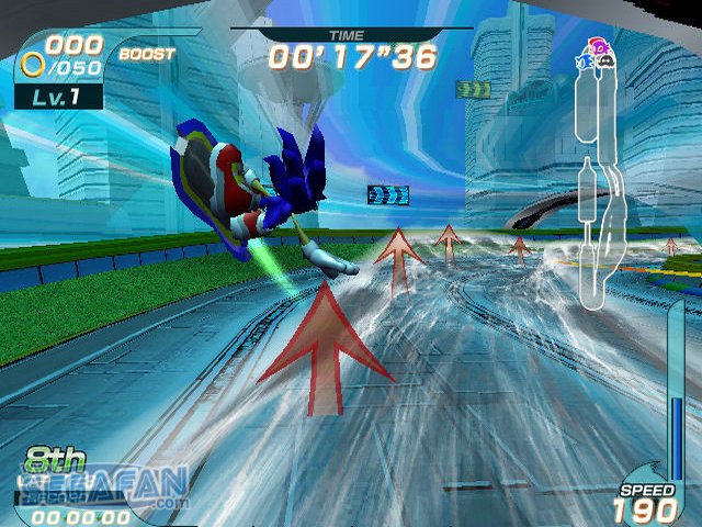 El sistema de control que el Sonic Team ha decidido dar al juego es, cuanto menos, controvertido, ya que su estilo se aleja bastante de la sencillez e inmediatez que sería de esperar en un título de este corte. Las tablas cuentan con una carga de aire que se irá vaciando lentamente a medida que se avanza y de forma súbita si usamos el turbo, mientras que se rellenará fundamentalmente realizando acrobacias aéreas aunque habrá otros medios como las plataformas-surtidores repartidas por los circuitos que detendrán la tabla unos instantes, cuanto más tiempo sobre ellas, mayor será el repostaje. Si el aire se agota, el personaje tendrá que ir corriendo con la tabla bajo el brazo, buscando de forma desesperada algún lugar donde reponerlo. Durante las carreras será posible atacar y ser atacado por otros competidores, lo que detendrá el avance del agredido unos dos o tres segundos, algo que puede ser casi definitivo de suceder en la última vuelta.