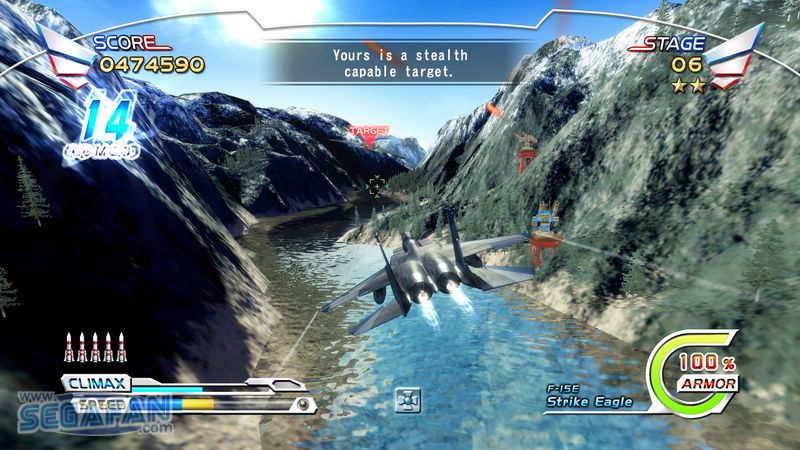 A pesar de esta férrea fidelidad a sus añejos orígenes, como os comentaba anteriormente AM2 no se ha resistido a adaptar un poco ciertos aspectos al jugador tipo actual. La primera de estas modificaciones es que aparte del ya mítico F-14 del juego original, estarán disponibles también otros dos cazas, el F-15 y el F-18, aunque no parecen diferenciarse en nada que no sea su apariencia externa. Entrando ya en lo puramente jugable, hay pequeños cambios, como la existencia de una barra que indica el porcentaje de daños del avión o que ahora los misiles se repongan poco a poco con el paso del tiempo sin tener que esperar al avión nodriza de turno; pero sin lugar a dudas el de mayor incidencia es la incorporación del modo Climax, al activarlo el tiempo se ralentizará y la retícula de disparo aumentará de tamaño durante unos breves instantes para facilitar el apuntar a los enemigos que estén en ese momento en pantalla, al volver la acción a su ritmo habitual una lluvia de cohetes saldrá disparada hacia los enemigos designados destruyéndolos sin remisión.
