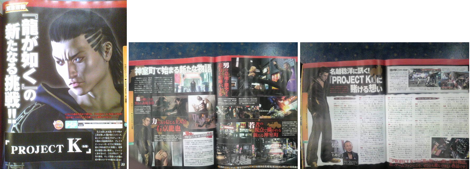 Project K protagonista en Famitsu ORD (21-4-2010)Según recoge la web alemana Gamefront, Famitsu ha publicado un primer avance de Project K, la nueva entrega de la serie Yakuza. En el mismo podemos ver que la plataforma elegida para el juego ha sido PSP, así como el aspecto del nuevo protagonista y algunas capturas en juego.Scans
